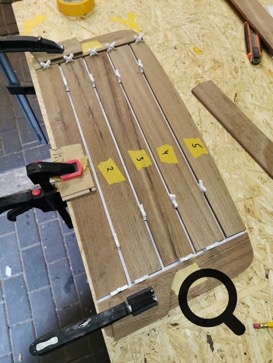 I'm finally ready to cover the stern extension with teak. Here, too, everything starts with a cardboard template. In the workshop I then sawed the teak to size, put it together like a puzzle on the template, fixed it and grouted it with Sikaflex 290DC. The gold band here also helps that the Sika does not get onto the entire wood after smoothing (with a small spatula). I then placed teak panels in the frames that I had previously sawn to size with a fine jigsaw blade. You need weights for even results when grouting!