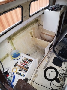 Today, I have had to cut out the lower part of the wooden partition, between the saloon and the room in the bow, on the starboard side, as the wood has become soft and rotten over the years due to permanent water in the bilge. I first had to split the ground to get at the wood that is down on the hull bottom.