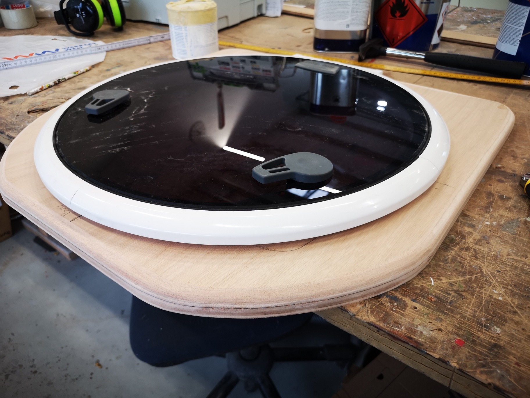 Die originale Luke hat 46 Jahre tapfer ihren Dienst verrichtet. Sie ist aber nicht zeitgemäß, schließt nicht gut und läßt, verschlossen, kein Licht ins Schiff. Die neue Luke ist von LEWMAR und sie ist rund. Ich habe eine 24 cm starke Bootssperrholzplatteauf die Maße 60 x 60 cm zurecht gesägt. …