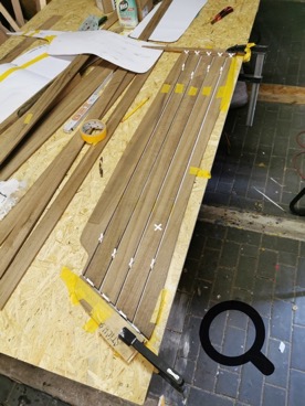 Auf dem Laufdeck müssen die 35mm breiten und 8mm starken Leisten in die richtige Form gezwungen werden. Das geht auch hier am besten, indem man nach dem Aufbringen des Klebers (Sikaflex 290 DC PRO) zwischen den Fugen Schrauben mit kleinen, stabilen Kunstoff- oder Holzplätchen anbringt. Auch hier müssen vor dem Verfugen mit Sikaflex 298 jede Leiste mit Goldband abgeklebt werden, damit sie beim glatt ziehen des überschüssigen Klebers (mit einem sehr schmalen Spachtel) nicht so voll sauen.
