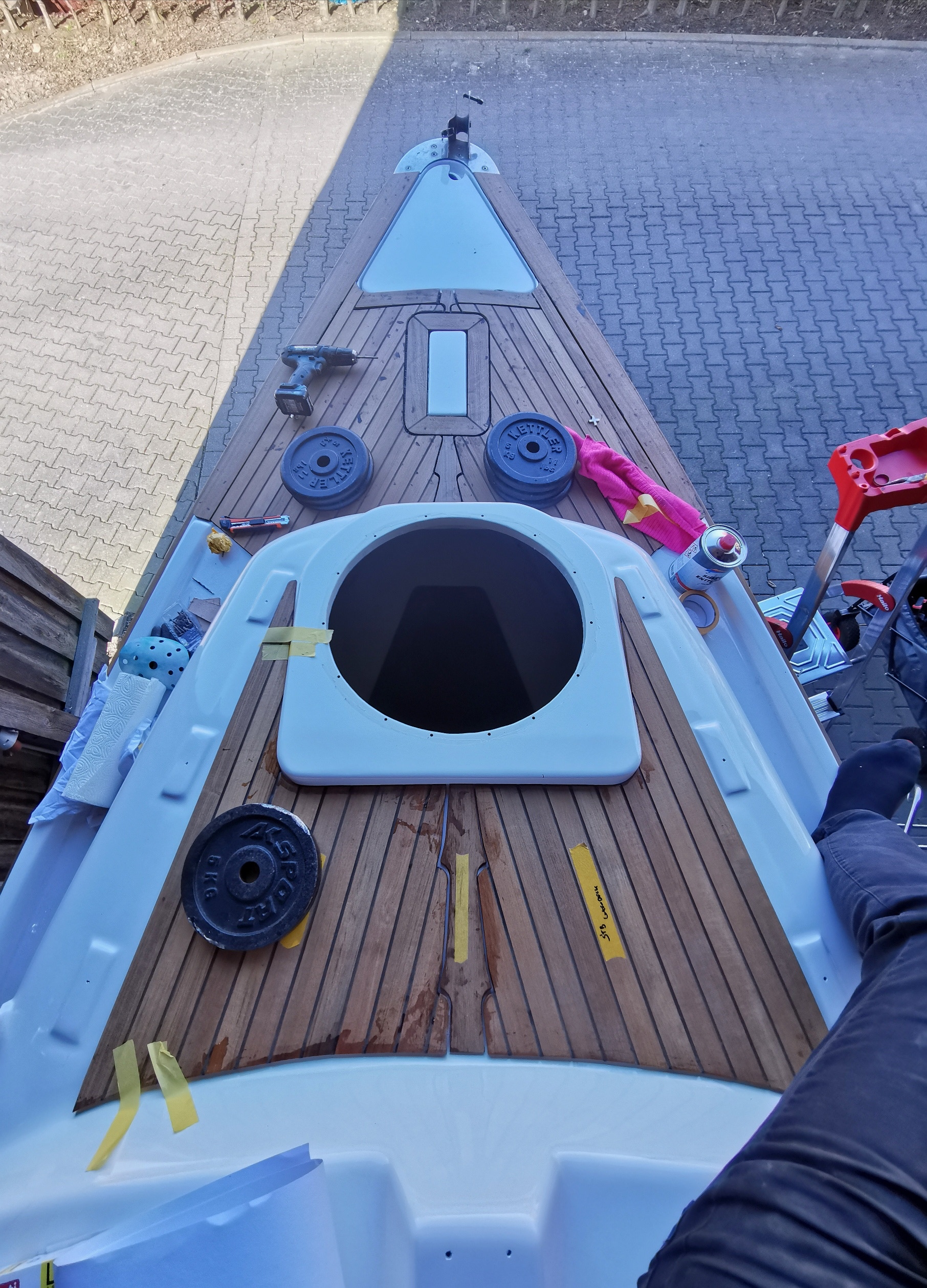 Die Teakarbeiten. schreiten nur sehr langsam voran. Es sind viele kleine Arbeitsschritte nötig, damit am Ende alles gut aussehen wird. Vor dem Verkleben der Fugen müssen die Ränder des Teak mit Klebeband geschützt werden. Zuvor mussten die Fugen mit Aceton gesäubert werden. Das braucht Zeit. Wenn die Fugenmasse nach 2-3 Tagen fest ist, kann man sie mit dem Exzenterschleifer plan schleifen.