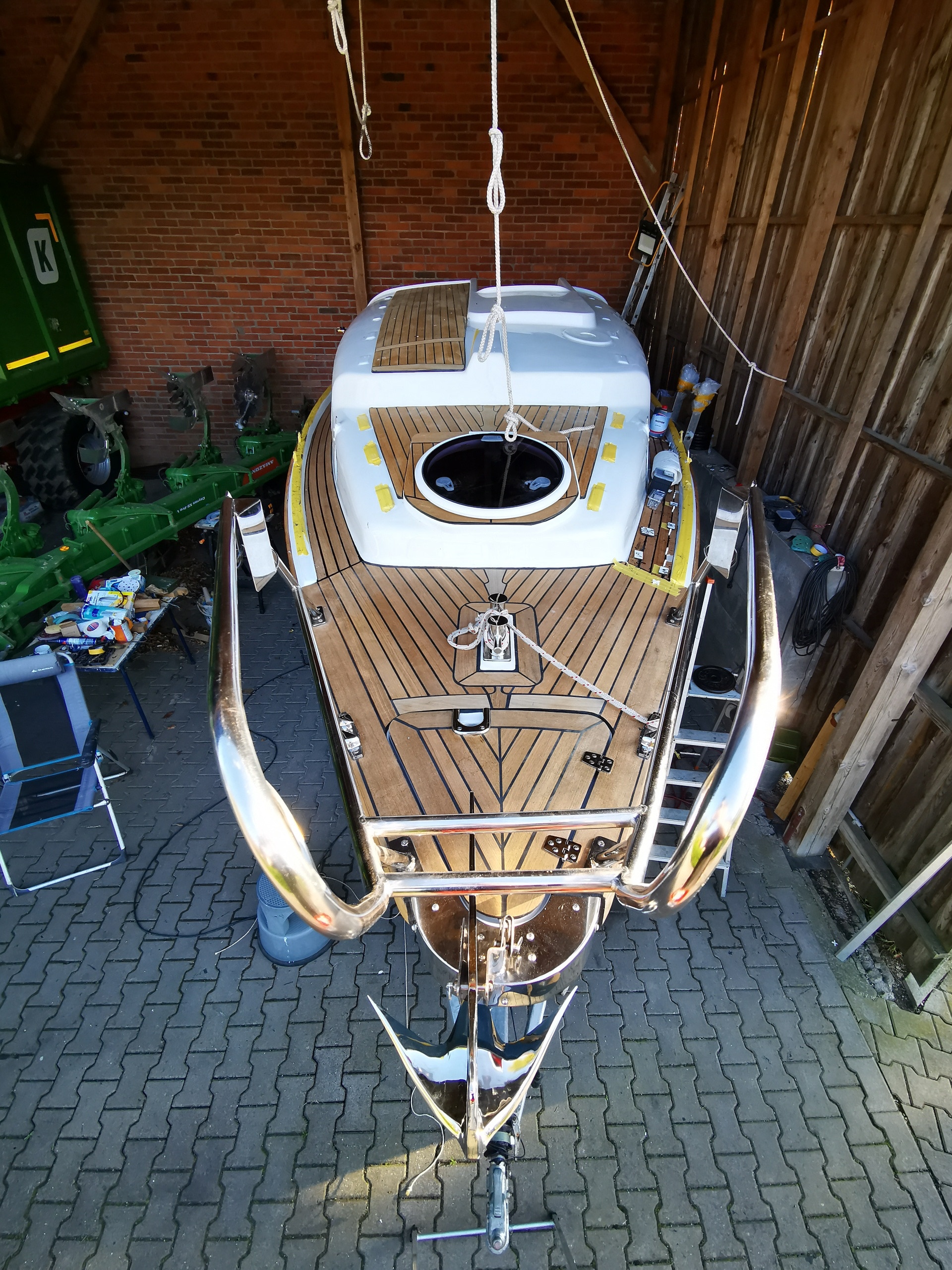Das Boot steht wieder bei mir und nun können die Decksaufbauten zur Montage vorbereitet werden und wird das Teak-Deck in den kommenden Monaten erstellt.