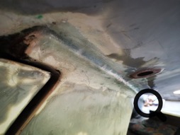 Neben den Schleifarbeiten müssen noch die alten Borddurchlässe geschlossen werden. Bevor ich mehrere Lagen Epoxy-getränkte Glasfasermatten aufbringen kann, muss der Bereich um die Löcher konkav geschliffen werden.