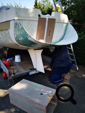 The outboard well is now also sawn and has a reinforcement glued on for screwing on the heavy outboard motor flange.