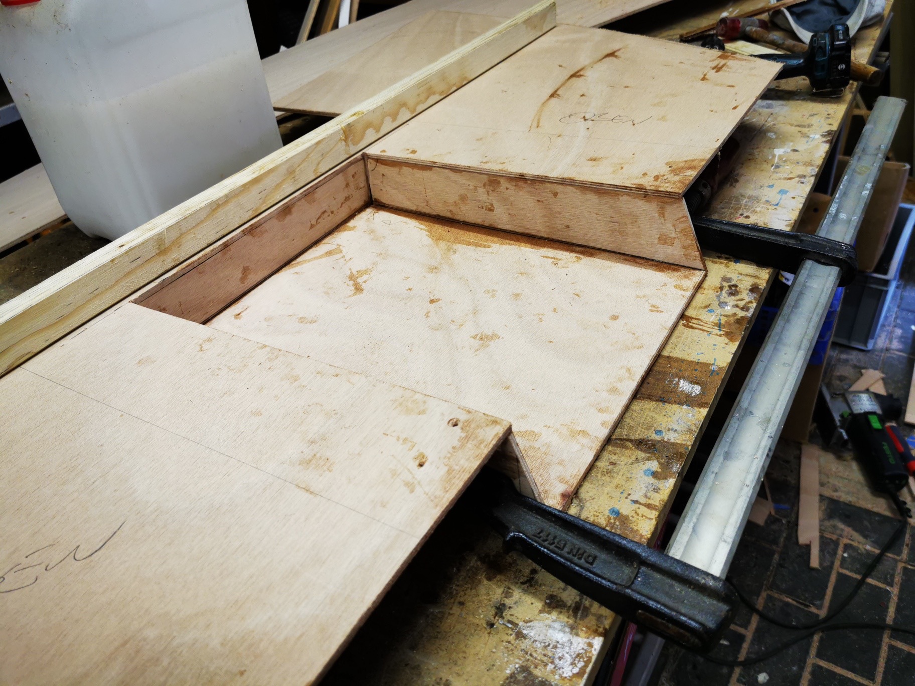 After the base was firmly glued in place, I glued in the second sandwich layer. With a stapler, clamps and stones I pressed the second layer onto the first layer until these are also firmly glued.