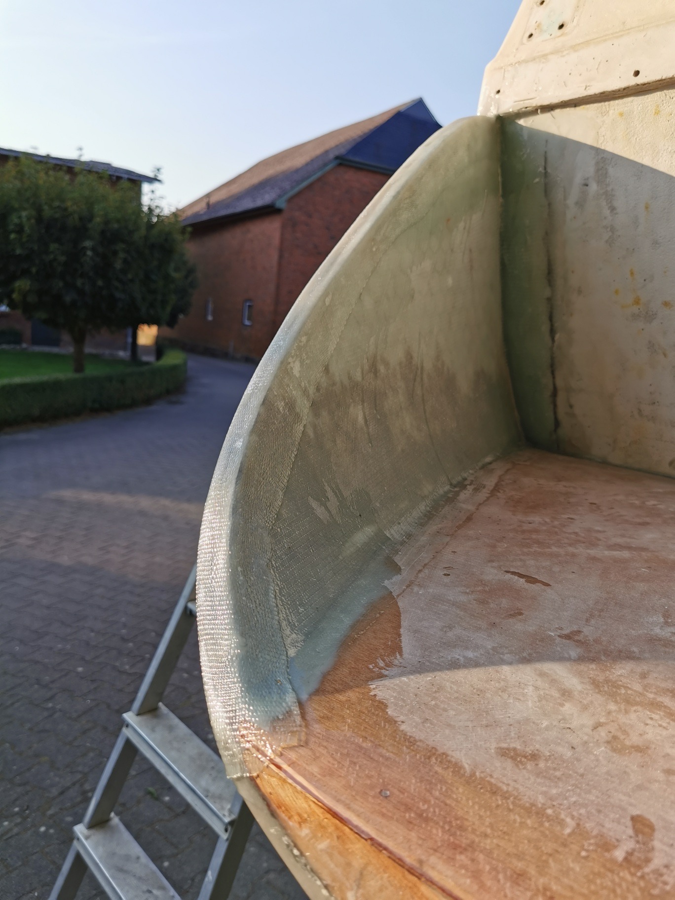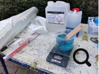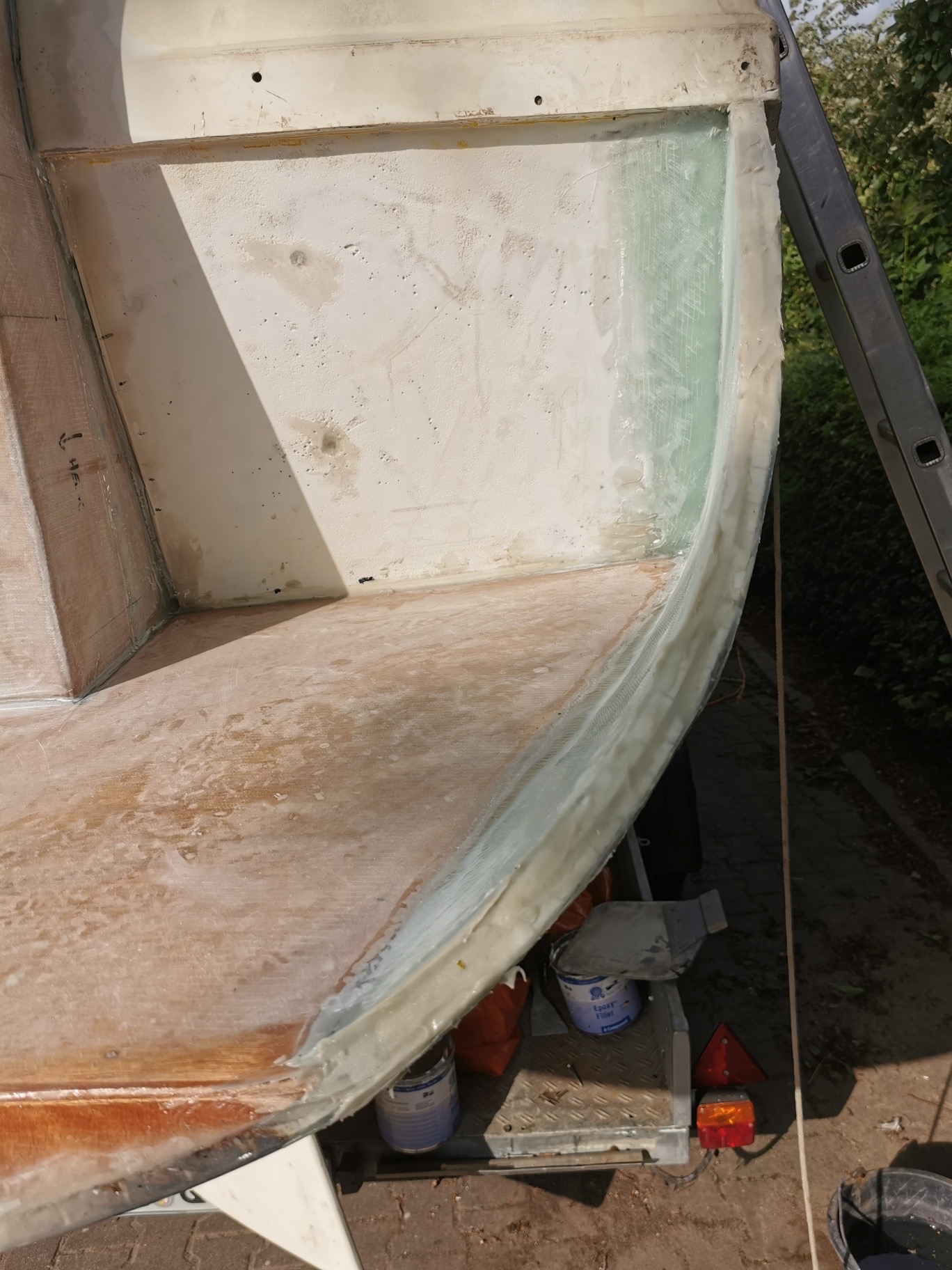 In the first layer my mixing ratio was wrong, which I noticed in time before I mixed the epoxy for the second layer. The glass fiber mats that had already been cut out were also too small, although I had cut them out the day before with the addition of a template. Then I had to do some tricks. The sun also bothered me, because in the sun the epoxy gels and attracts much faster. Fortunately, my epoxy had a pot life of 110 minutes. ;-)